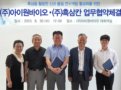 아이원바이오가 흑삼칸과 업무협약을 맺고 흑삼을 활용한 신규물질 연구개발 사업을 공동 추진하기로 했다.출처 : 헬스경향(http://www.k-health.com)아이원바이오가 흑삼칸과 손잡고 흑삼을 활용한 신규물질 연구개발에 박차를 가한다.아이원바이오는 30일 본사 대회의실에서 흑삼칸과 업무협약을 체결했다고 밝혔다.이번 업무협약을 통해 양 사는 흑삼을 활용한 신규물질 연구개발 활성화를 위한 공동사업화를 추진한다.흑삼칸은 전통방식에 의거한 구중구포를 통해 홍삼보다 높은 효능을 나타낼 뿐 아니라 증포과정에서 발생하는 유해물질들을 완전히 차단, 기존 흑삼의 단점은 보완하고 장점은 극대화하는 제조공법을 개발, 지난해 특허청장상을 받았다.이에 흑삼칸은 국내 지역기관들과 협력해 양질의 인삼을 제공받아 특허기술로 고품질 흑삼의 원료를 제공하고 아이원바이오는 흑삼을 활용한 신규물질 연구개발을 통해 다양한 의약품 및 건강기능식품 개발에서 공동사업을 진행한다는 방침이다.한편 아이원바이오는 지난해 모다자산운용사와 상장준비를 하면서 외부투자를 받아 더욱 공격적인 연구개발을 진행해왔다. 특히 아이원바이오의 VNP-16(비트로넥틴펩타이드)’ 골질환 특허물질은 지난해 8월 치의학분야 국제학술지 ‘임상 치주과학 저널(Journal of Clinical Periodontology)’ 8월호 커버이미지로 선정돼 신규물질 연구개발 기업으로 인정받은 바 있다.